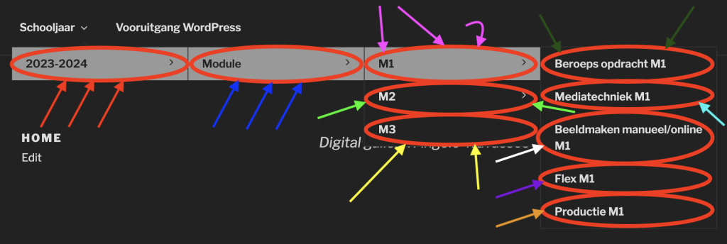 Het rode pijltjes geven aan dat ik verder heb gewerkt aan de categorie van de menu, De blauwe pijltjes zijn voor de onder categorie van “2023-2024 die weer aangeeft welke jaar”